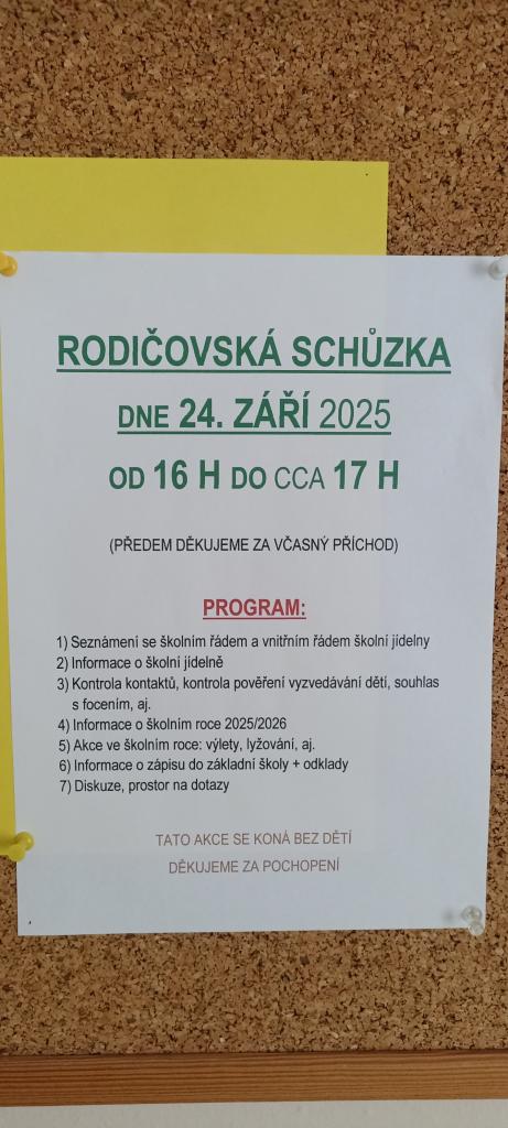 Ve středu 24. 9. Od 16 h proběhne ve školce rodičovská schůzka.